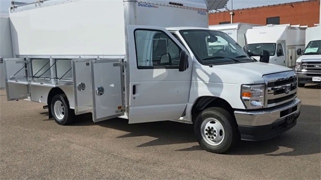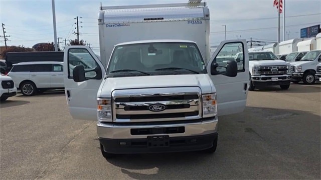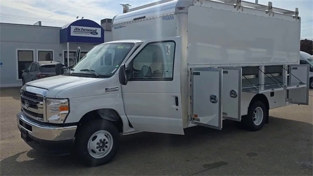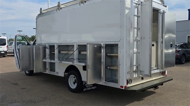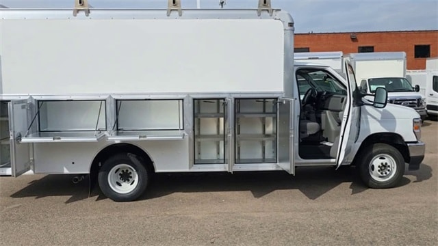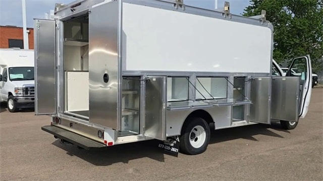 2026 Ford E-450SD RWD Oxford White**158"Wheel Base** FEATURES 14ft DuraCube Max High Roof Enclosed Service Utility Body**7.3L V8 Engine**6 Speed Automatic Transmission**14,500 GVWR**Cruise Control**55 Gallon Fuel Tank**The Dura Cube Max is 14FT L x 8FT W x 78" Internal Height**The Bulkhead for the utility body has a sliding door to access the cab** Aluminum Shelving (adjustable)**Ladder Rack**Power Locks for the Utility Body**LED Marker Lights**LED Dome Lights**Rear View Camera and Back Up Alarm**
