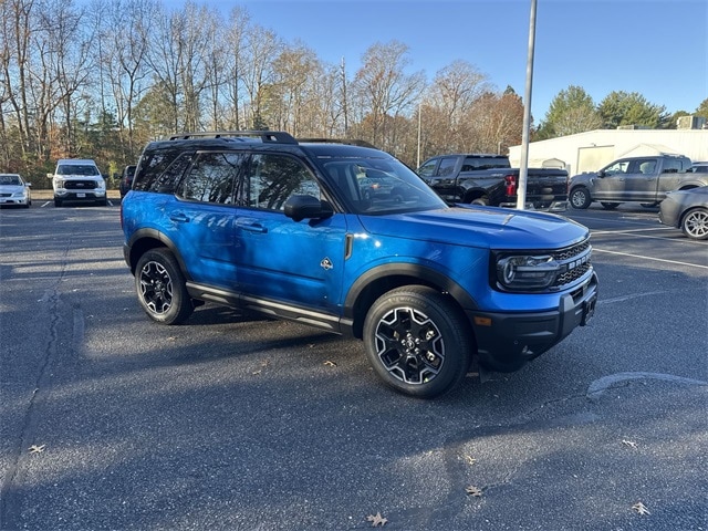 Velocity Blue Metallic 2025 Ford Bronco Sport Outer Banks 4WD 8-Speed Automatic 1.5L EcoBoost 360-Degree Camera w/Trail & Split View, 4-Wheel Disc Brakes, 6 Speakers, ABS brakes, Air Conditioning, Alloy wheels, AM/FM radio: SiriusXM, AM/FM Stereo, Auto High-beam Headlights, Auto-dimming Rear-View mirror, Automatic temperature control, B&O Sound System by Bang & Olufsen, Brake assist, Compass, Connected Navigation, Delay-off headlights, Driver door bin, Driver vanity mirror, Dual front impact airbags, Dual front side impact airbags, Electronic Stability Control, Emergency communication system: SYNC 4 911 Assist, Four wheel independent suspension, Front anti-roll bar, Front Bucket Seats, Front Center Armrest, Front Driver/Passenger Seat Back Map Pockets, Front dual zone A/C, Front fog lights, Front License Plate Bracket, Front Parking Sensors, Front reading lights, Fully automatic headlights, Garage door transmitter, HD Radio, Heated door mirrors, Heated front seats, Heated steering wheel, Illuminated entry, Knee airbag, Low tire pressure warning, Memory seat, Occupant sensing airbag, Outer Banks Tech Package+, Outside temperature display, Overhead airbag, Overhead console, Panic alarm, Passenger door bin, Passenger vanity mirror, Power door mirrors, Power driver seat, Power passenger seat, Power steering, Power windows, Premium Trimmed Front Bucket Seats w/Ebony/Roast, Premium Trimmed Front Bucket Seats w/Platinum Blue, Radio data system, Rain sensing wipers, Rear anti-roll bar, Rear Parking Sensors, Rear reading lights, Rear seat center armrest, Rear window defroster, Rear window wiper, Remote keyless entry, Reverse Brake Assist, Security system, SiriusXM, Speed control, Speed-sensing steering, Speed-Sensitive Wipers, Split folding rear seat, Steering wheel mounted audio controls, SYNC 4 w/Enhanced Voice Recognition, Tachometer, Telescoping steering wheel, Tilt steering wheel, Traction control, Trip computer, Variably intermittent wipers, Wheels: 18" Ebony Black-Painted Aluminum.