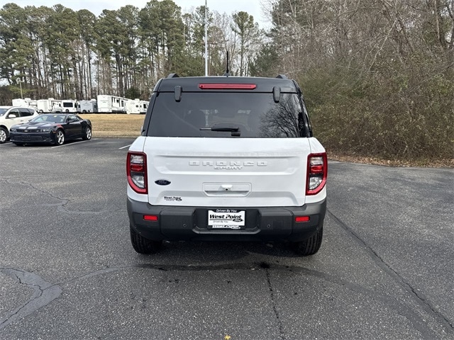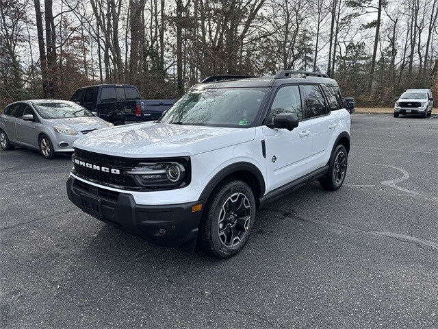 Oxford White 2025 Ford Bronco Sport Outer Banks 4WD 8-Speed Automatic 1.5L EcoBoost 2nd Row Carpeted Seatback, 360-Degree Camera w/Trail & Split View, 4-Wheel Disc Brakes, 6 Speakers, ABS brakes, Air Conditioning, Alloy wheels, AM/FM radio: SiriusXM, AM/FM Stereo, Auto High-beam Headlights, Auto-dimming Rear-View mirror, Automatic temperature control, B&O Sound System by Bang & Olufsen, Brake assist, Cargo Management System (Shelf/Divider/Table), Compass, Connected Navigation, Delay-off headlights, Driver door bin, Driver vanity mirror, Dual front impact airbags, Dual front side impact airbags, Electronic Stability Control, Emergency communication system: SYNC 4 911 Assist, Four wheel independent suspension, Front anti-roll bar, Front Bucket Seats, Front Center Armrest, Front Driver/Passenger Seat Back Map Pockets, Front dual zone A/C, Front fog lights, Front License Plate Bracket, Front Parking Sensors, Front reading lights, Fully automatic headlights, Garage door transmitter, HD Radio, Heated door mirrors, Heated front seats, Heated steering wheel, Illuminated entry, Knee airbag, Low tire pressure warning, Memory seat, Occupant sensing airbag, Outer Banks Tech Package+, Outside temperature display, Overhead airbag, Overhead console, Panic alarm, Passenger door bin, Passenger vanity mirror, Power door mirrors, Power driver seat, Power passenger seat, Power steering, Power windows, Premium Trimmed Front Bucket Seats w/Ebony/Roast, Premium Trimmed Front Bucket Seats w/Platinum Blue, Radio data system, Rain sensing wipers, Rear anti-roll bar, Rear Parking Sensors, Rear reading lights, Rear seat center armrest, Rear window defroster, Rear window wiper, Remote keyless entry, Reverse Brake Assist, Security system, SiriusXM, Speed control, Speed-sensing steering, Speed-Sensitive Wipers, Split folding rear seat, Steering wheel mounted audio controls, SYNC 4 w/Enhanced Voice Recognition, Tachometer, Telescoping steering wheel, Tilt steering wheel, Traction control, Trip computer, Variably intermittent wipers, Wheels: 18" Ebony Black-Painted Aluminum.