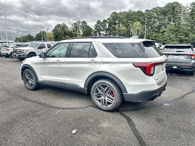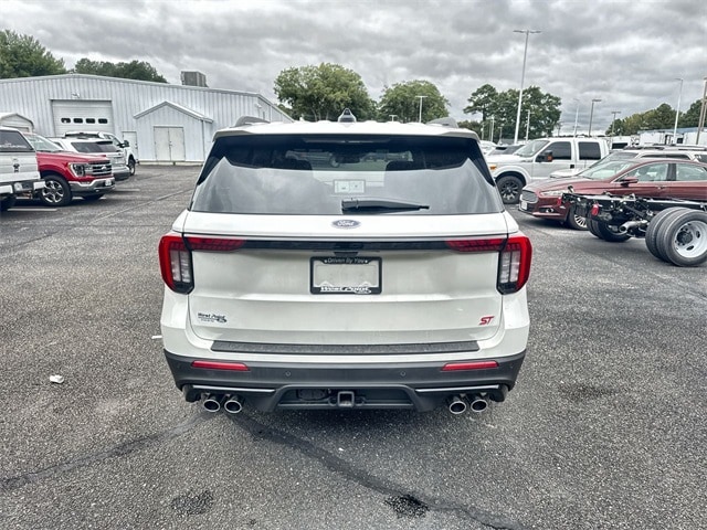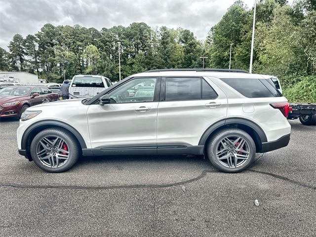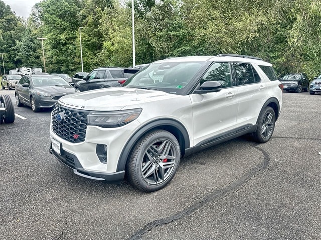 Star White Metallic Tri-Coat 2025 Ford Explorer ST 4WD 10-Speed Automatic 3.0L EcoBoost V6 4WD, 10 Speakers, 3.58 Non-Limited Slip Rear Axle, 3rd row seats: bench, 4-Wheel Disc Brakes, ABS brakes, Air Conditioning, Alloy wheels, AM/FM radio: SiriusXM with 360L, Apple CarPlay/Android Auto, Auto High-beam Headlights, Auto-dimming door mirrors, Auto-dimming Rear-View mirror, Automatic temperature control, Brake assist, Bumpers: body-color, Compass, Delay-off headlights, Driver door bin, Driver vanity mirror, Dual front impact airbags, Dual front side impact airbags, Electronic Stability Control, Emergency communication system: 911 Assist, Equipment Group 400A Standard Package, Exterior Parking Camera Rear, Ford BlueCruise Equipped (1-Year Plan), Four wheel independent suspension, Front anti-roll bar, Front Bucket Seats, Front Center Armrest, Front dual zone A/C, Front fog lights, Front License Plate Bracket, Front reading lights, Fully automatic headlights, Garage door transmitter, Heated door mirrors, Heated front seats, Heated rear seats, Heated steering wheel, Heated/Ventilated Miko Sport Captain's Chairs, Illuminated entry, Knee airbag, Leather steering wheel, Low tire pressure warning, Memory seat, Navigation System, Occupant sensing airbag, Outside temperature display, Overhead airbag, Overhead console, Panic alarm, Passenger door bin, Passenger vanity mirror, Power door mirrors, Power driver seat, Power Liftgate, Power passenger seat, Power steering, Power windows, Radio: B&O Sound System by Bang & Olufsen, Rain sensing wipers, Rear air conditioning, Rear anti-roll bar, Rear reading lights, Rear window defroster, Rear window wiper, Remote keyless entry, SecuriCode Keyless Entry Keypad, Security system, Speed control, Speed-sensing steering, Speed-Sensitive Wipers, Split folding rear seat, Spoiler, Sport steering wheel, Steering wheel mounted audio controls, Tachometer, Telescoping steering wheel, Tilt steering wheel, Traction control, Trip computer, Turn signal indicator mirrors, Variably intermittent wipers, Ventilated front seats, Wheels: 21" Magnetite-Painted Aluminum, 4WD.