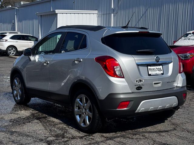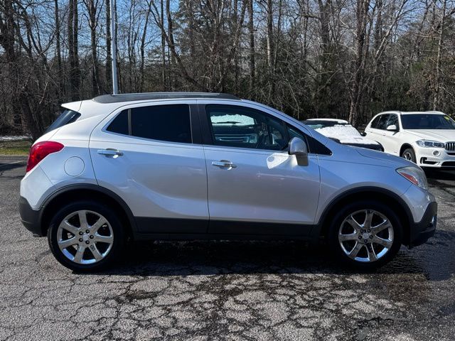 Quicksilver Metallic 2013 Buick Encore Convenience FWD 6-Speed Automatic ECOTEC 1.4L I4 SMPI DOHC Turbocharged VVT 120-Volt Power Outlet, 18" Chromed Aluminum Wheels, 1SD Equipment Group, 3.53 Final Drive Ratio, 4-Wheel Disc Brakes, 6 Speakers, ABS brakes, Air Conditioning, Alloy wheels, AM/FM radio: SiriusXM, Auto-Dimming Inside Rear-View Mirror, Auto-dimming Rear-View mirror, Automatic temperature control, Bose Premium 7-Speaker Audio System Feature, Brake assist, Bumpers: body-color, CD player, Compass, Delay-off headlights, Driver door bin, Driver vanity mirror, Driver's Seat Mounted Armrest, Dual front impact airbags, Dual front side impact airbags, Dual-Zone Automatic Climate Control, Electronic Stability Control, Emergency communication system: OnStar Directions & Connections, Exterior Parking Camera Rear, Front anti-roll bar, Front Bucket Seats, Front dual zone A/C, Front Fog Lamps, Front fog lights, Front License Plate Bracket, Front reading lights, Front wheel independent suspension, Fully automatic headlights, Heated door mirrors, Illuminated entry, Knee airbag, Leather steering wheel, Low tire pressure warning, Occupant sensing airbag, Outside temperature display, Overhead airbag, Panic alarm, Passenger door bin, Passenger vanity mirror, Power door mirrors, Power driver seat, Power steering, Power windows, Premium audio system: IntelliLink, Radio data system, Radio: AM/FM Audio System w/MP3 CD Player, Rear seat center armrest, Rear side impact airbag, Rear window defroster, Rear window wiper, Remote keyless entry, Remote Vehicle Starter System, Ride & Handling Suspension, Roof rack: rails only, Security system, SiriusXM Satellite Radio, Speed control, Speed-sensing steering, Split folding rear seat, Spoiler, Steering wheel mounted audio controls, Tachometer, Telescoping steering wheel, Tilt steering wheel, Traction control, Trip computer, Upscale Cloth w/Leatherette Accents, Variably intermittent wipers, Wheels: 18" Painted Cast Aluminum.