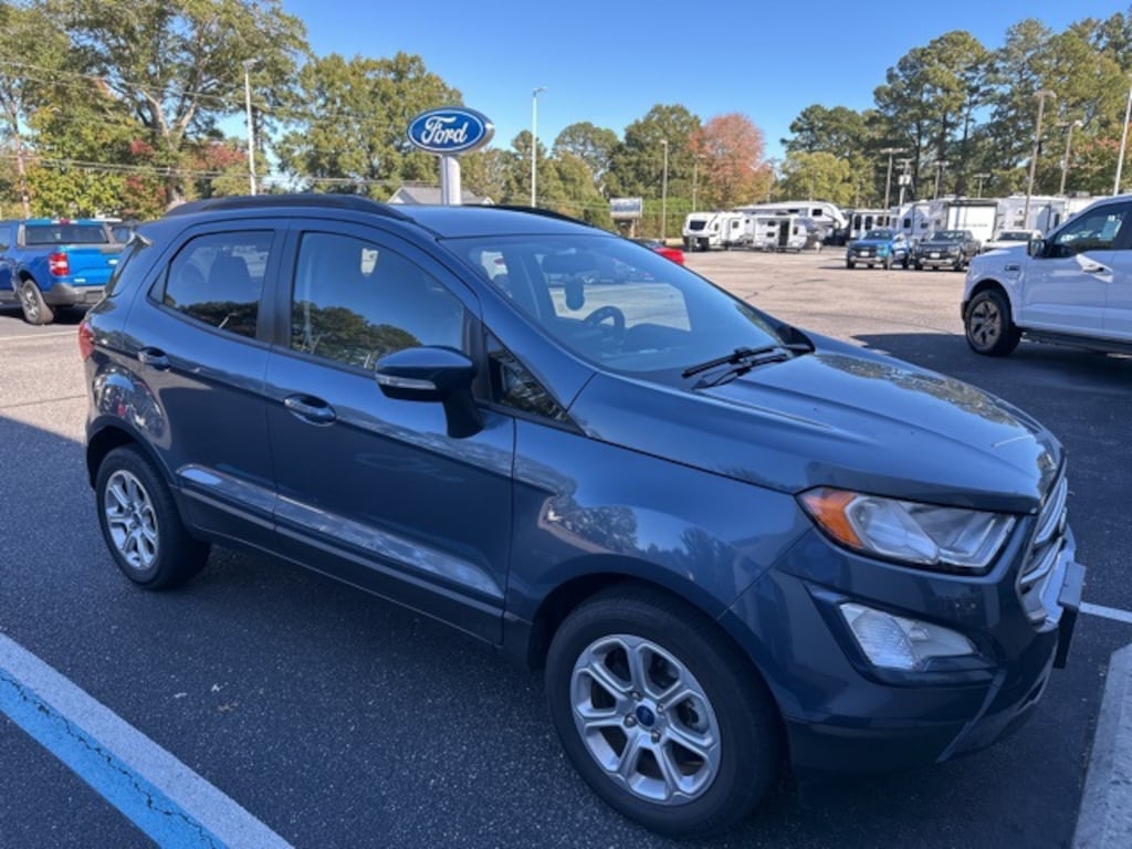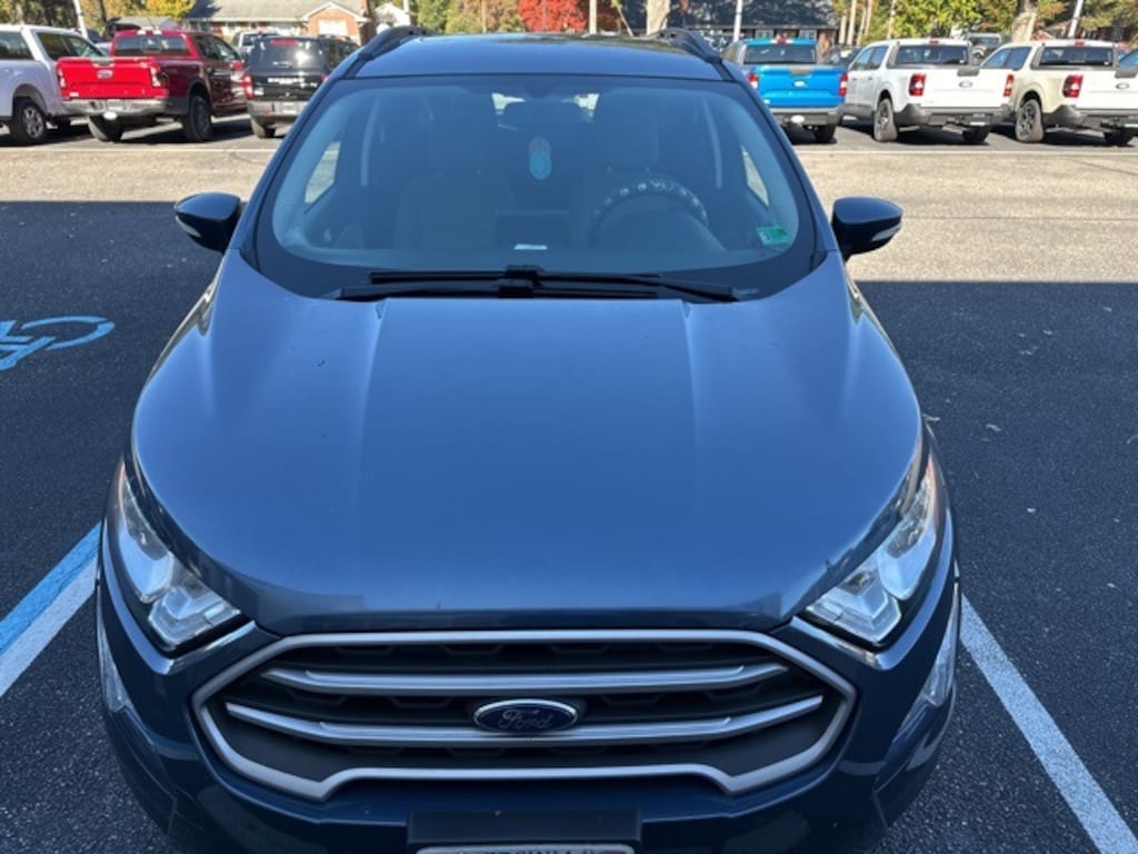 Certified. Blue Metallic 2021 Ford EcoSport SE FWD 6-Speed Automatic EcoBoost 1.0L I3 GTDi DOHC Turbocharged VCT Ford Blue Advantage: Blue Certified Certified, Equipment Group 200A, 3.44 Axle Ratio, 4-Wheel Disc Brakes, 6 Speakers, ABS brakes, Air Conditioning, Alloy wheels, AM/FM radio: SiriusXM, AppLink/Apple CarPlay and Android Auto, Automatic temperature control, Brake assist, Bumpers: body-color, Compass, Delay-off headlights, Driver door bin, Driver vanity mirror, Dual front impact airbags, Dual front side impact airbags, Electronic Stability Control, Emergency communication system: SYNC 3 911 Assist, Exterior Parking Camera Rear, Front anti-roll bar, Front Bucket Seats, Front Center Armrest, Front fog lights, Front License Plate Bracket, Front reading lights, Front wheel independent suspension, Fully automatic headlights, Heated front seats, Illuminated entry, Knee airbag, Leather Shift Knob, Low tire pressure warning, Occupant sensing airbag, Outside temperature display, Overhead airbag, Overhead console, Panic alarm, Passenger door bin, Passenger vanity mirror, Power door mirrors, Power moonroof, Power steering, Power windows, Radio data system, Radio: AM/FM/MP3 Stereo, Rear Parking Sensors, Rear seat center armrest, Rear side impact airbag, Rear window defroster, Rear window wiper, Remote keyless entry, Roof rack: rails only, SiriusXM Radio, Speed control, Speed-sensing steering, Split folding rear seat, Steering wheel mounted audio controls, SYNC 3 Communications & Entertainment System, Tachometer, Telescoping steering wheel, Tilt steering wheel, Traction control, Trip computer, Turn signal indicator mirrors, Unique Cloth Heated Front Bucket Seats, Variably intermittent wipers, Wheels: 16" Shadow Silver-Painted Aluminum, **LOCAL TRADE**, Equipment Group 200A.