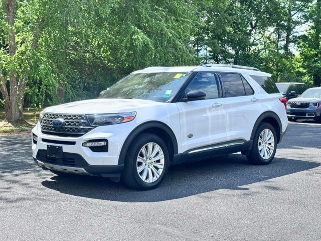 Certified. Star White Metallic Tri-Coat 2022 Ford Explorer King Ranch 4WD 10-Speed Automatic 3.0L EcoBoost V6 Ford Certified, 4WD, 10.1" LCD Capacitive Portrait Touchscreen, 12 Speakers, 1st Row Heated Seats, 2 Additional Speakers, 2nd Row Heated Seat Controls Credit, 3.31 Non-Limited-Slip Rear Axle Ratio, 3rd row seats: bench, 4-Wheel Disc Brakes, ABS brakes, Air Conditioning, Alloy wheels, AM/FM radio: SiriusXM, Auto High-beam Headlights, Auto-dimming door mirrors, Auto-dimming Rear-View mirror, Automatic temperature control, Brake assist, Bumpers: body-color, Class IV Trailer Tow Package, Compass, Delay-off headlights, Driver door bin, Driver vanity mirror, Dual front impact airbags, Dual front side impact airbags, Electronic Stability Control, Emergency communication system: SYNC 3 911 Assist, Equipment Group 701A, Exterior Parking Camera Rear, FordPass Connect, Four wheel independent suspension, Front & Second Row Floor Liners (16B), Front anti-roll bar, Front Bucket Seats, Front Center Armrest, Front dual zone A/C, Front fog lights, Front License Plate Bracket, Front reading lights, Fully automatic headlights, Garage door transmitter, Genuine wood dashboard insert, Heated door mirrors, Heated front seats, Heated rear seats, Heated steering wheel, Illuminated entry, Knee airbag, Leather steering wheel, Low tire pressure warning, Memory seat, Mesa Del Rio Lthr Htd/Vent Capt's Chairs, Navigation System, Occupant sensing airbag, Outside temperature display, Overhead airbag, Overhead console, Panic alarm, Passenger door bin, Passenger vanity mirror, Power door mirrors, Power driver seat, Power Liftgate, Power passenger seat, Power steering, Power windows, Premium Technology Package, Radio data system, Radio: B&O Sound System by Bang & Olufsen, Rain sensing wipers, Rear air conditioning, Rear anti-roll bar, Rear Auxiliary Controls Credit, Rear reading lights, Rear window defroster, Rear window wiper, Remote keyless entry, Roof rack: rails only, Security system, Speed control, Speed-sensing steering, Speed-Sensitive Wipers, Split folding rear seat, Spoiler, Steering wheel memory, Steering wheel mounted audio controls, SYNC 3 Communications & Entertainment System, SYNC 3/Apple CarPlay/Android Auto, Tachometer, Telescoping steering wheel, Tilt steering wheel, Traction control, Trip computer, Turn signal indicator mirrors, Twin Panel Moonroof, Variably intermittent wipers, Ventilated front seats, Voice-Activated Touchscreen Navigation System, Wheels: 20" 10-Spoke Aluminum w/KR Center Cap, 4WD.