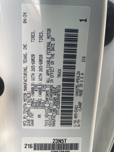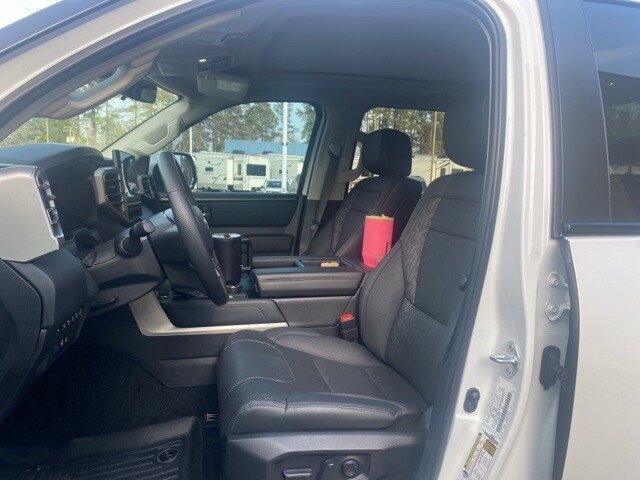 Ice Cap 2024 Toyota Tundra Hybrid Limited 4WD 10-Speed Automatic 3.4L V6 3.4L V6, 20" x 8" Alloy Wheels, 3.31 Axle Ratio, 4-Wheel Disc Brakes, 9 Speakers, ABS brakes, Air Conditioning, Alloy wheels, AM/FM radio: SiriusXM, Apple CarPlay/Android Auto, Auto High-beam Headlights, Auto-dimming door mirrors, Auto-dimming Rear-View mirror, Automatic temperature control, Brake assist, Bumpers: body-color, Delay-off headlights, Driver door bin, Driver vanity mirror, Dual front impact airbags, Dual front side impact airbags, Electronic Stability Control, Emergency communication system: Safety Connect (10-year trial), Exterior Parking Camera Rear, Front anti-roll bar, Front Bucket Seats, Front Center Armrest, Front dual zone A/C, Front fog lights, Front reading lights, Front wheel independent suspension, Fully automatic headlights, Garage door transmitter: HomeLink, Heated & Ventilated Front Bucket Seats, Heated door mirrors, Heated front seats, Heated steering wheel, Illuminated entry, Knee airbag, Leather Shift Knob, Low tire pressure warning, Memory seat, Navigation System, Occupant sensing airbag, Outside temperature display, Overhead airbag, Overhead console, Panic alarm, Passenger door bin, Passenger vanity mirror, Power door mirrors, Power driver seat, Power passenger seat, Power steering, Power windows, Radio data system, Radio: Audio Plus, Radio: Premium Audio w/JBL, Rear reading lights, Rear seat center armrest, Rear step bumper, Rear window defroster, Remote keyless entry, Security system, SofTex Seat Trim, Speed control, Speed-sensing steering, Split folding rear seat, Steering wheel mounted audio controls, Tachometer, Telescoping steering wheel, Tilt steering wheel, Traction control, Trip computer, Turn signal indicator mirrors, Variably intermittent wipers, Ventilated front seats, Voltmeter, 3.4L V6.